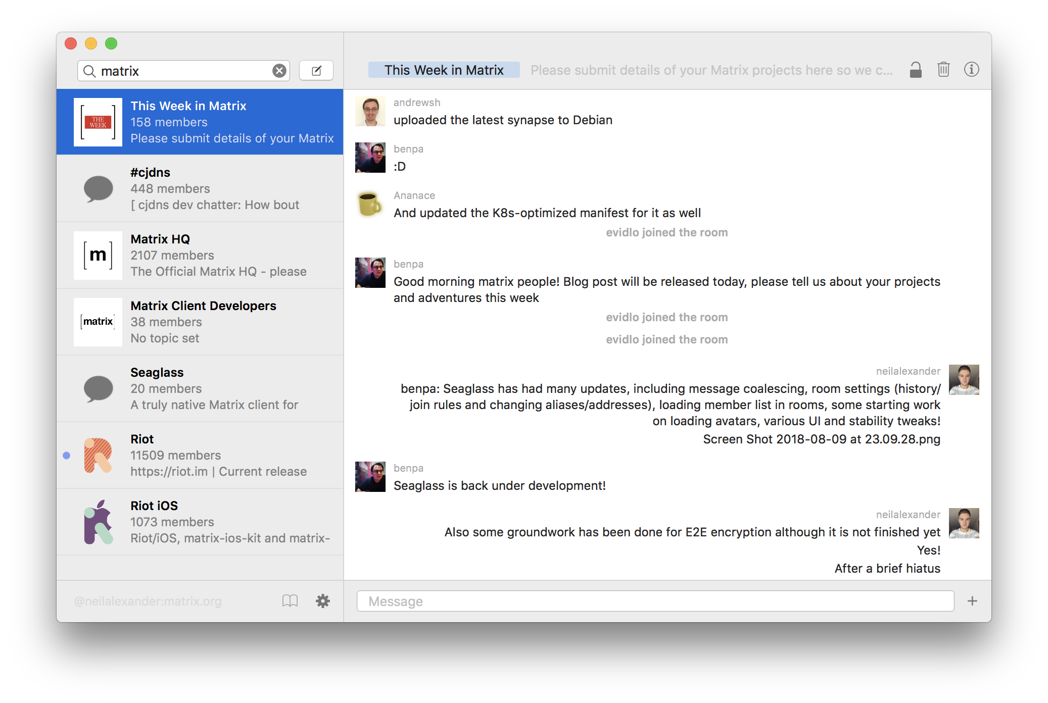Lots of discussion about this project, specifically the question of how to efficiently render Rich Text. macOS does not make this easy, so a solution being considered is to use a WebKit for room rendering: