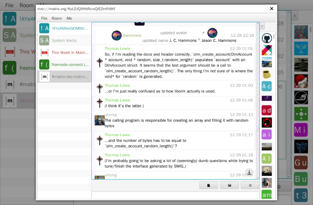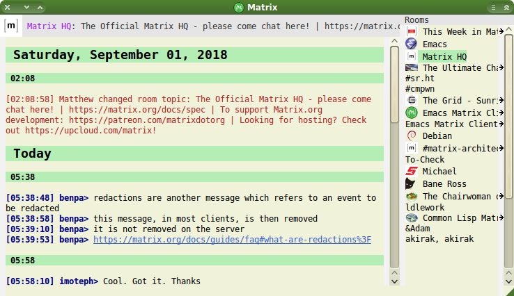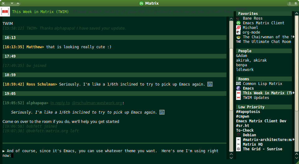 In the command line, gomuks appeared and quickly became a competent client, but in terms of sheer enthusiasm and momentum, I must give commendation to matrix-client.el, a newly revived mode for Emacs which turns your editor/OS into a great Matrix Client. I enjoyed using it enough that it began to change my mind about using emacs. Laptops have more than 8mb memory these days anyway.