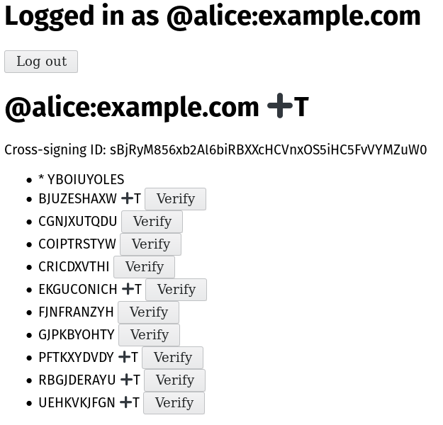 ...and here’s a screenshot of the final test jig for cross-signing devices in end-to-end encryption, so you will never have to manually verify new devices for a trusted user ever again! We demoed a very early version of this at FOSDEM, but this here is the testing harness for real deal, after several iterations of the spec and implementation to nail down the model. + means the device/user's cross-signing key is trusted, T means it's TOFU: